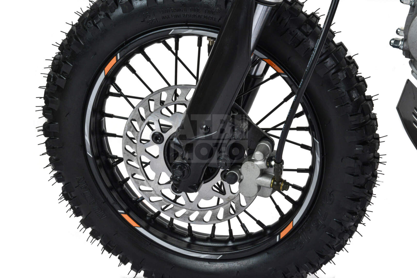 Безопасность и контроль: Питбайк оснащён дисковыми тормозами, с передним двухпоршневым суппортом и задним однопоршневым, что обеспечит уверенную остановку в любых ситуациях.